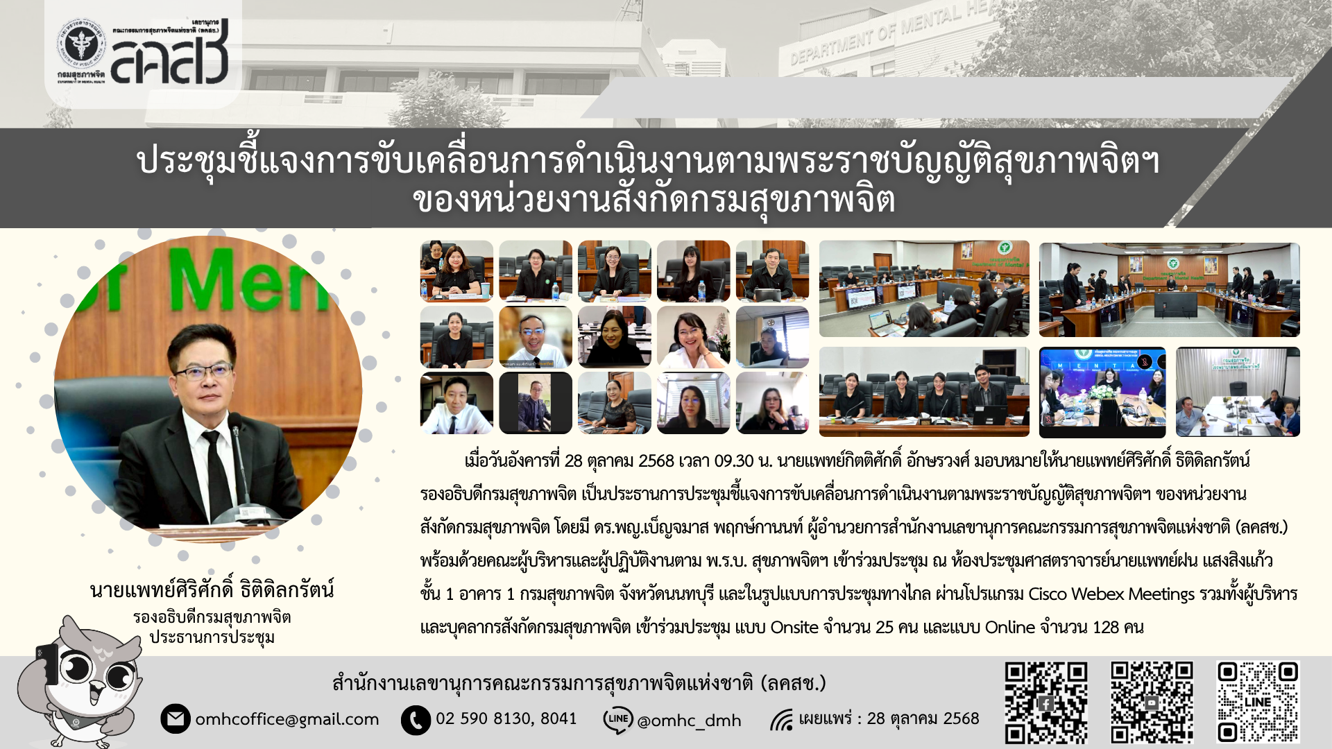 ประชุมชี้แจงการขับเคลื่อนการดำเนินงานตามพระราชบัญญัติสุขภาพจิตฯ ของหน่วยงานสังกัดกรมสุขภาพจิต