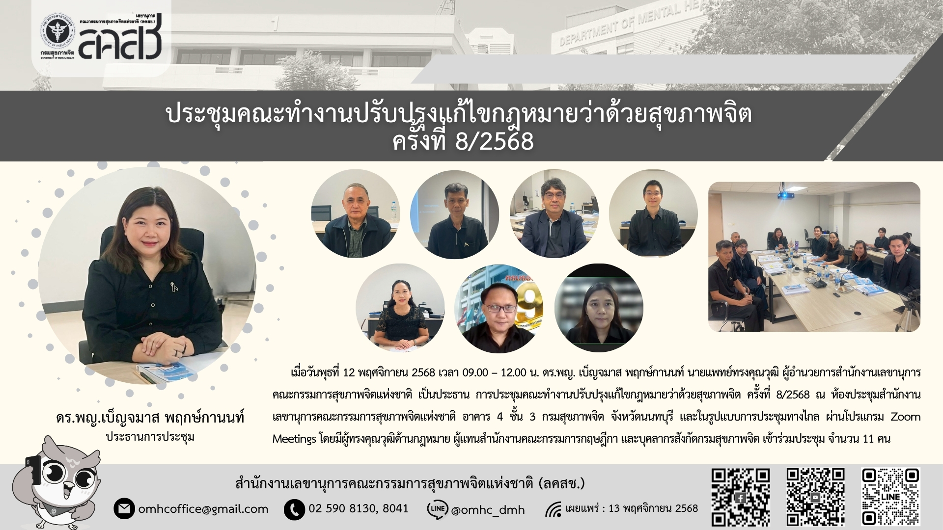 ประชุมคณะทำงานปรับปรุงแก้ไขกฎหมายว่าด้วยสุขภาพจิต ครั้งที่ 8/2568