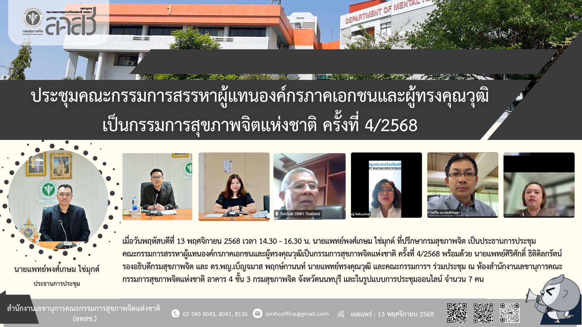 ประชุมคณะกรรมการสรรหาผู้แทนองค์กรภาคเอกชนและผู้ทรงคุณวุฒิเป็นกรรมการสุขภาพจิตแห่งชาติ ครั้งที่ 4/2568
