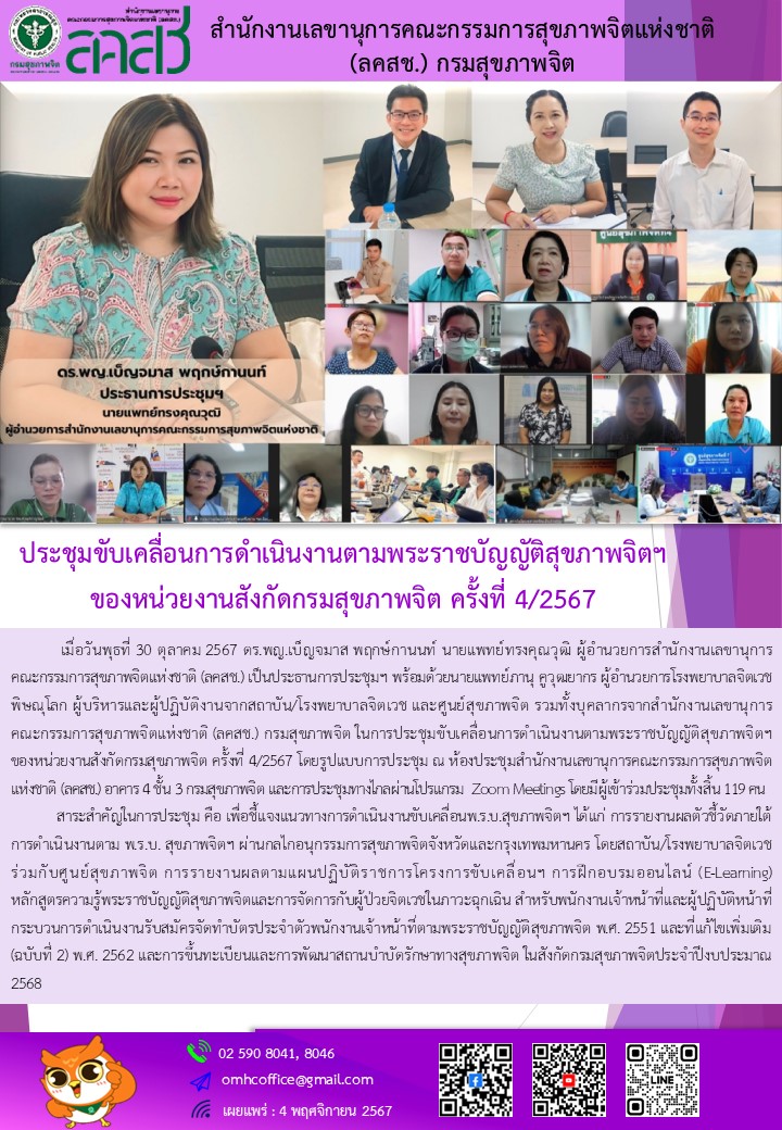 รายงานการประชุมขับเคลื่อนการดำเนินงานตามพระราชบัญญัติสุขภาพจิตฯ ครั้งที่ 4/2567